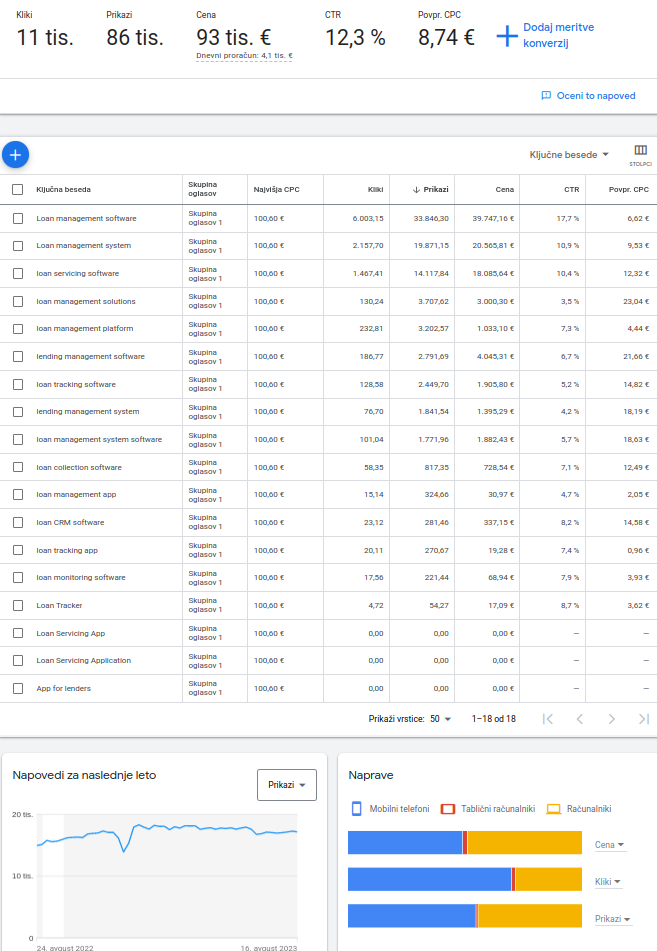 Rezultati napovedi za ključne besede v Google ads (Mesečno, Google in partnerska spletna mesta za iskanje, vsi jeziki, vse lokacije):